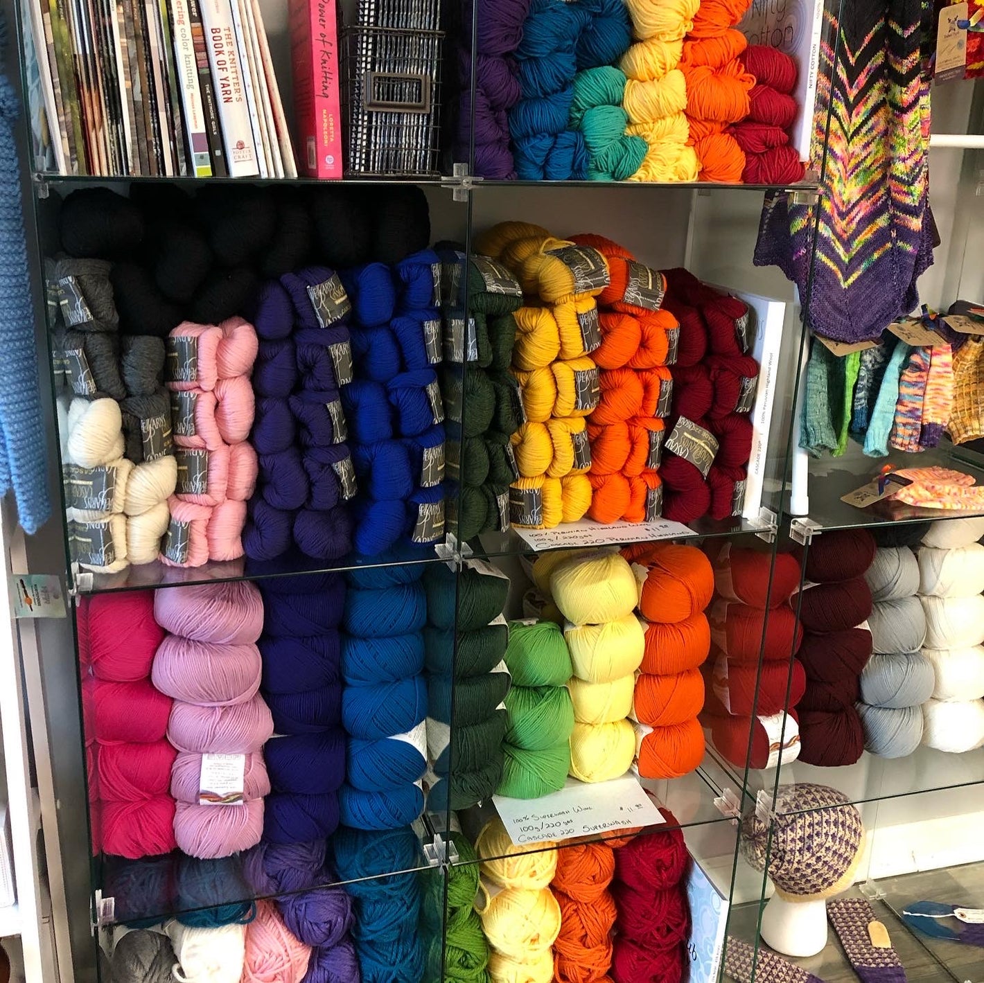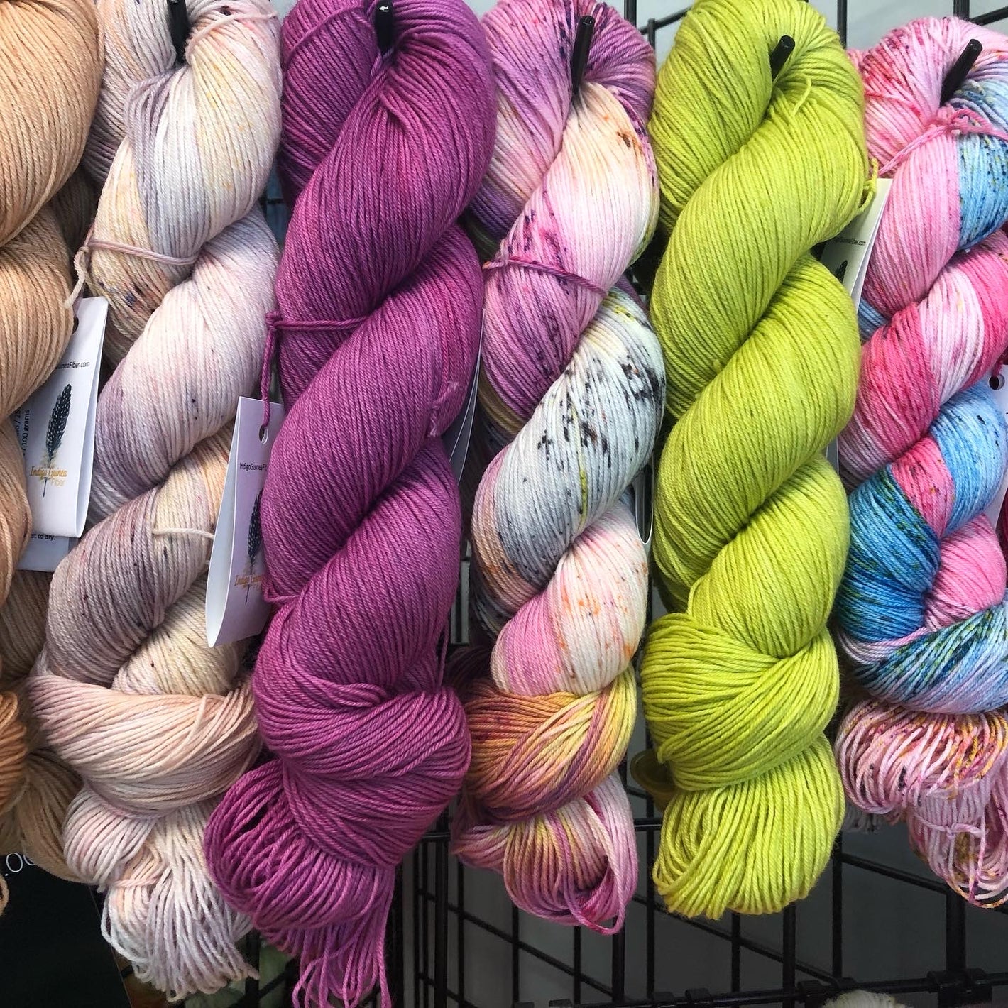 In order to offer some affordable options and bases not supplied by local dyers, we also carry Cascade Yarns. Current offerings include Nifty (worsted cotton), 220 Highland Wool (worsted), 220 Superwash (worsted), Hampton (DK cotton linen bland), and Cherub Bulky.