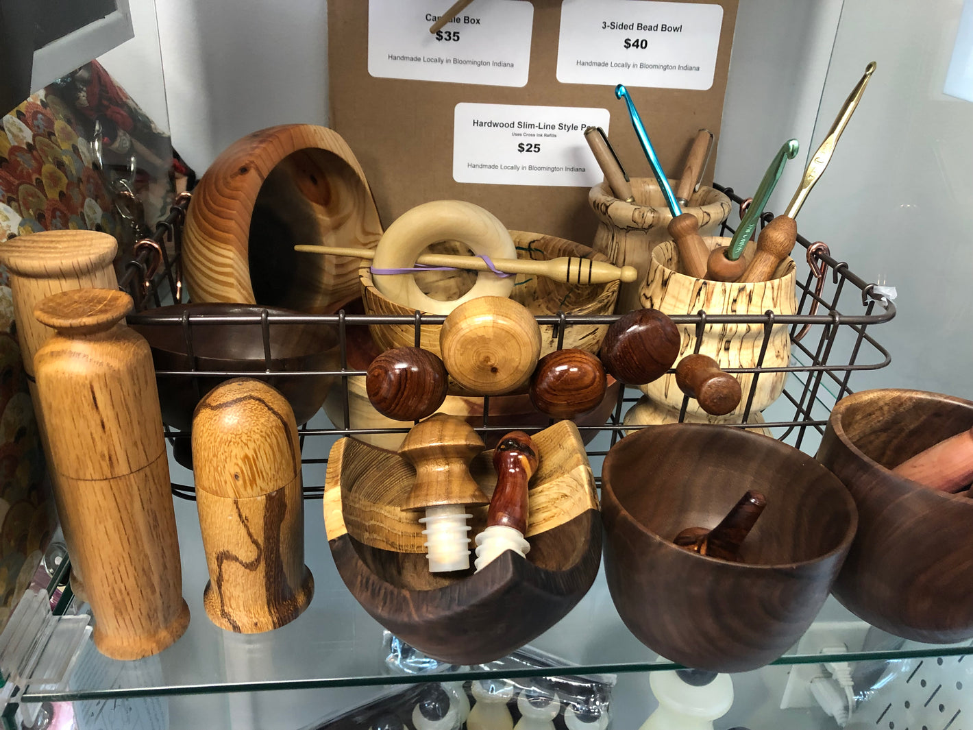 Give A Good Turn supplies our little shop with beautiful hand made wooden items, including one of a kind wooden shawl pins and wood handled crochet hooks from Bloomington, IN. Reach out to them for special orders.
