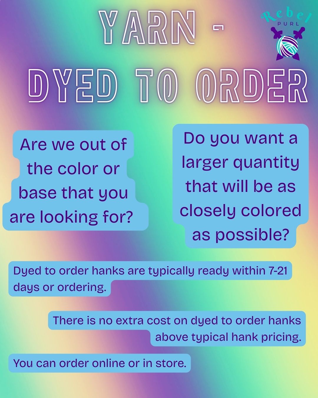 Dyed to order colors are added to the next open dye date. Your skeins will be ready anywhere from 7-21 days after your order.