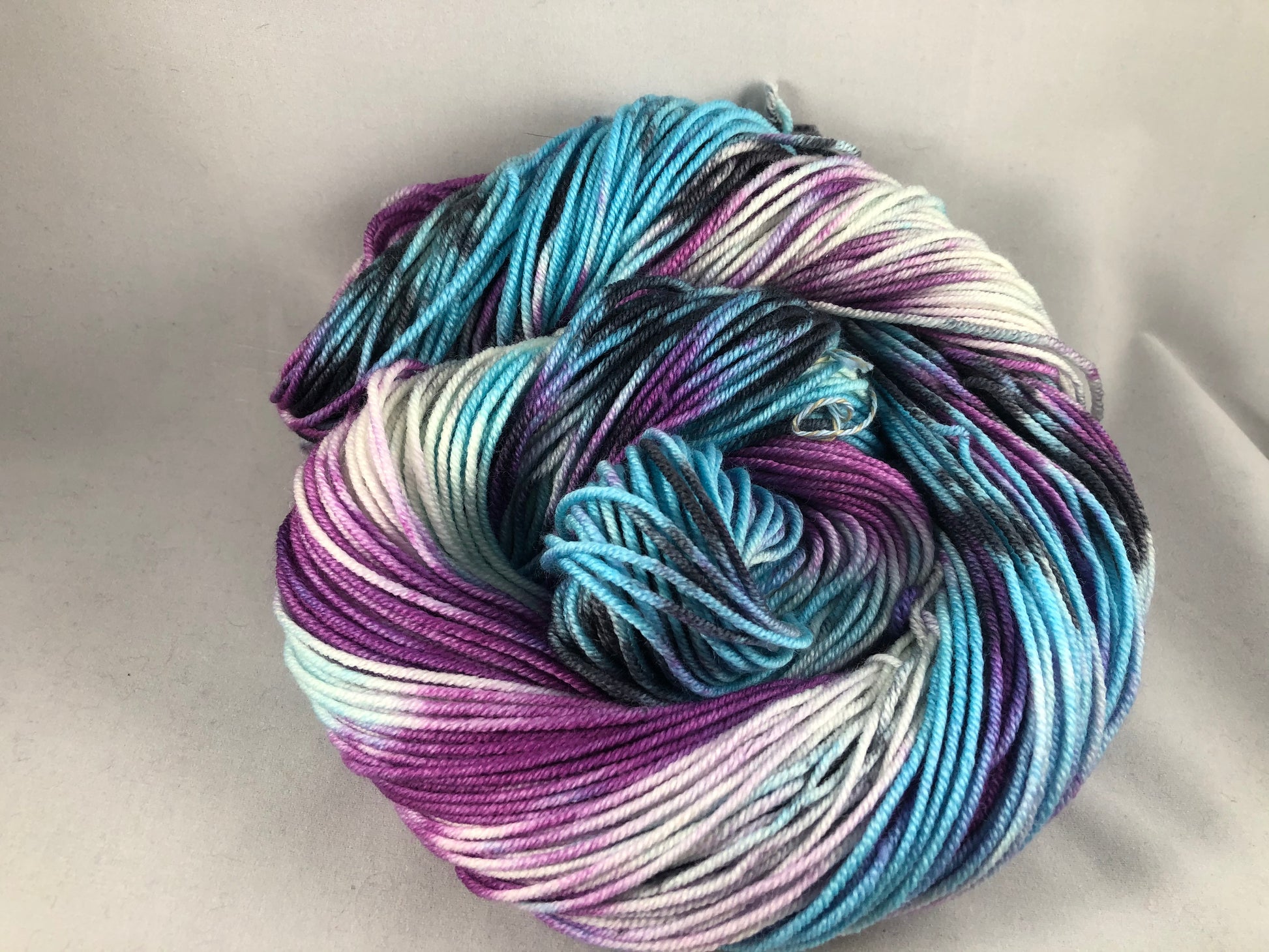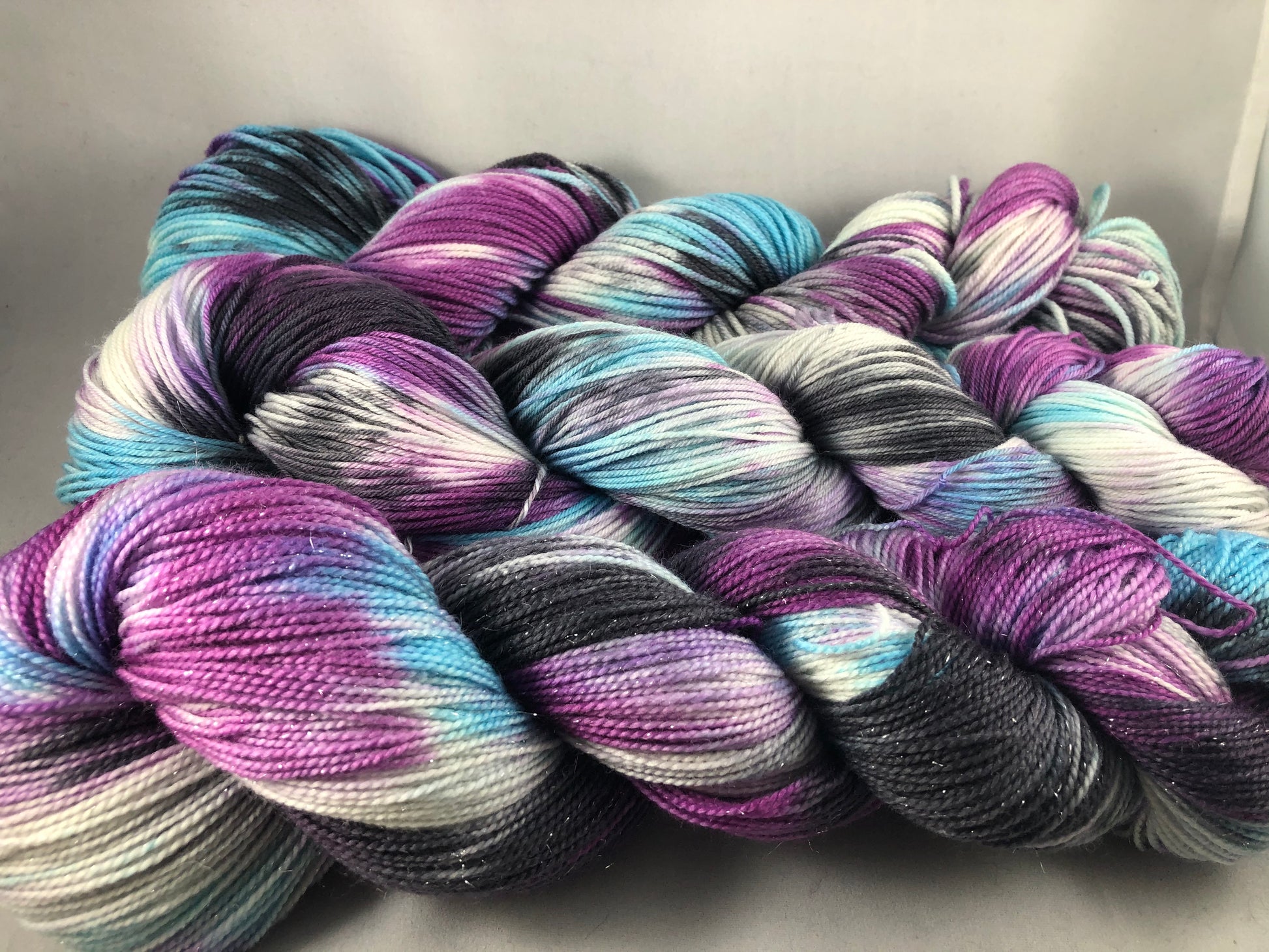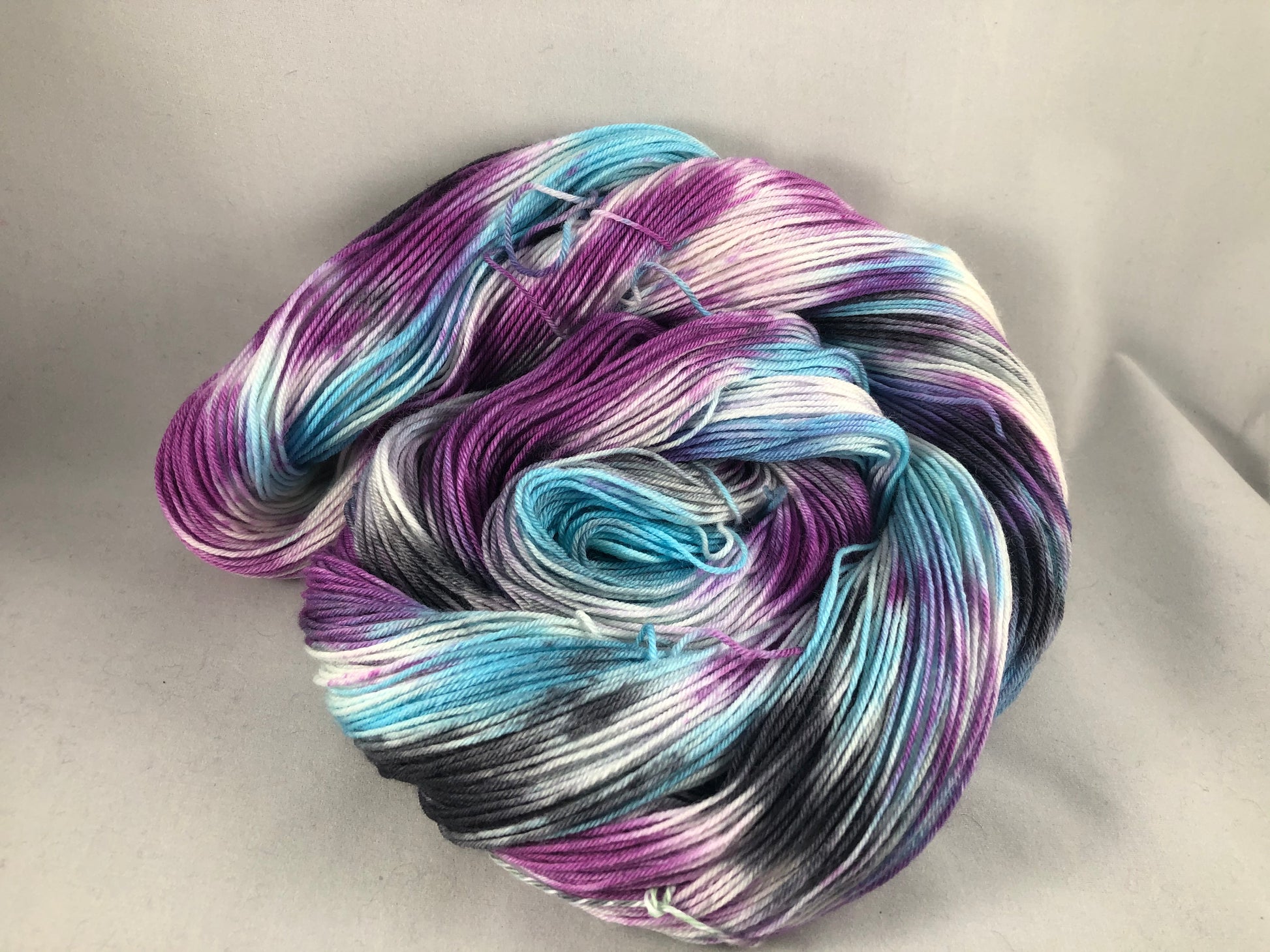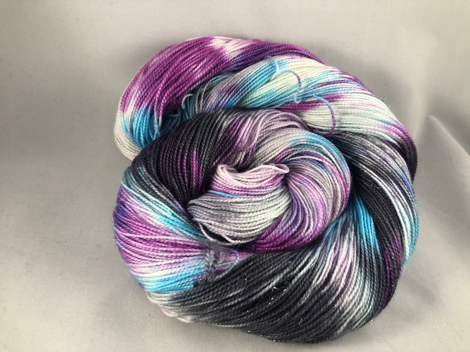 This twisted colorway features ice blue, deep lavender, silver and black.