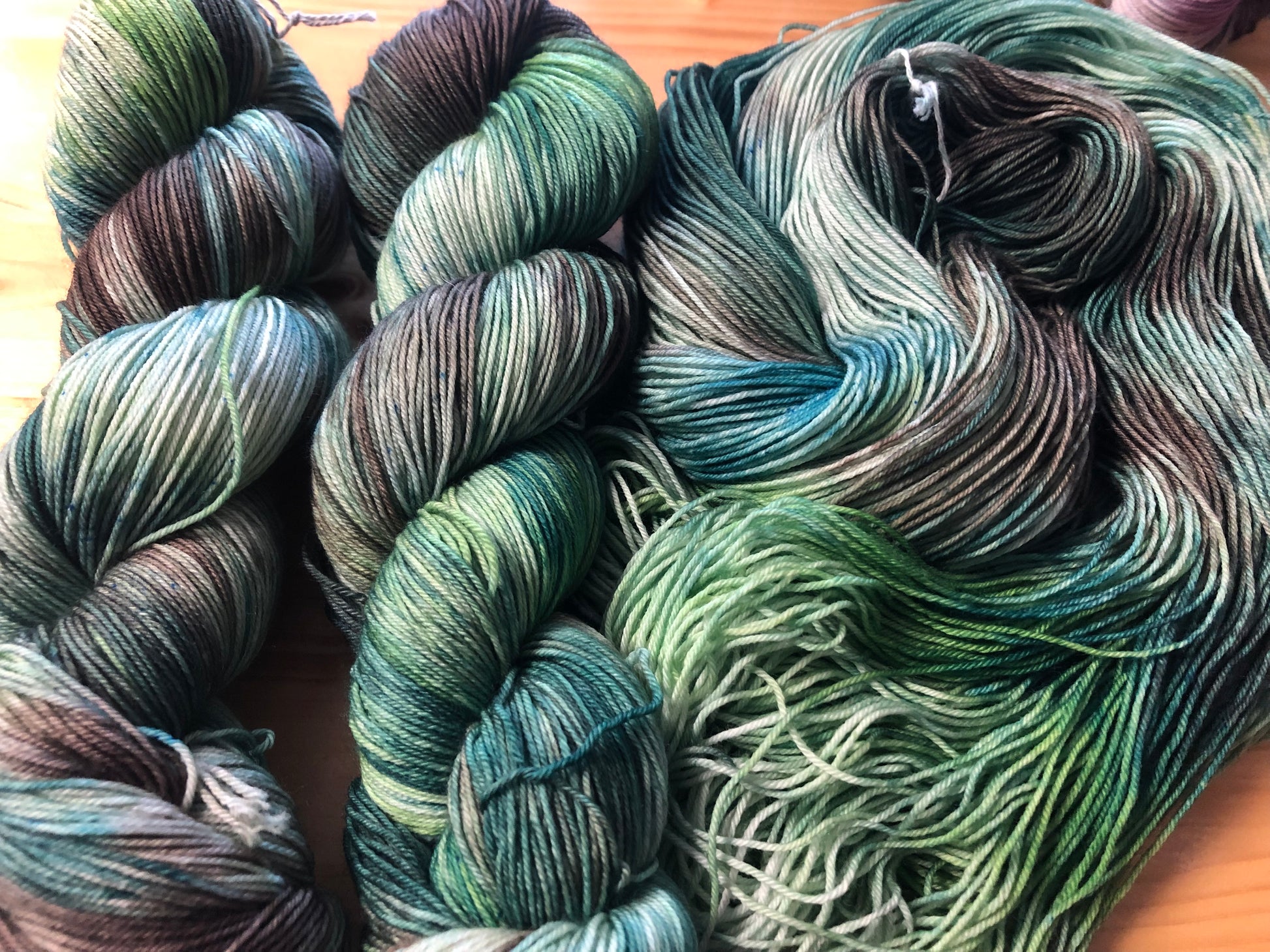 The Best of Busco is a variegated mix of greens with brown, all dyed up on 4 Plies of the Apocalypse.