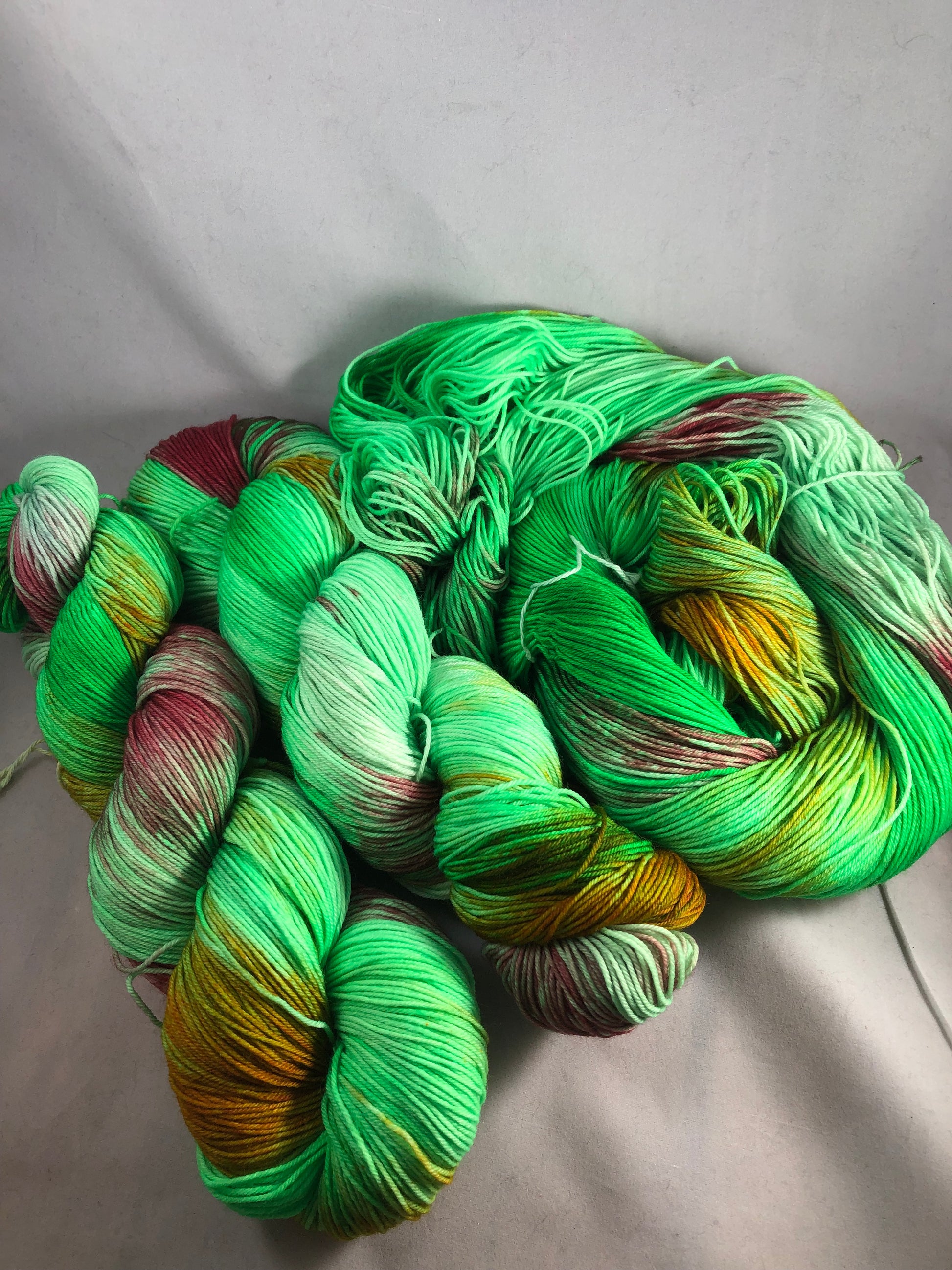 Loveland Frog Man is a variegated mix of greens with segments of orange and red, all dyed up on 4 Plies of the Apocalypse.