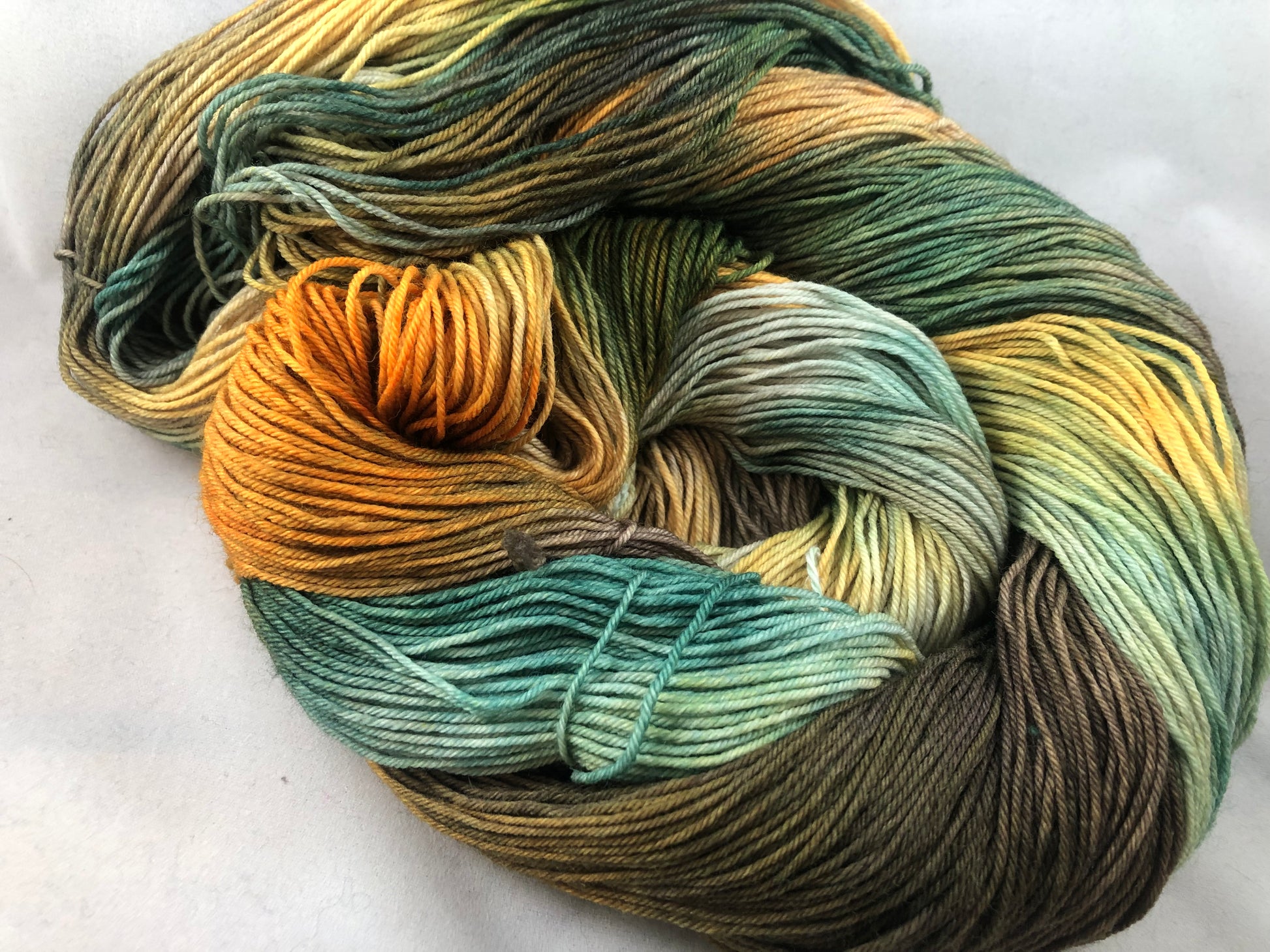 Rhinelander Hodag is a variegated mix of forest green and brown mixed with fluorescent orange, all dyed up on 4 Plies of the Apocalypse.