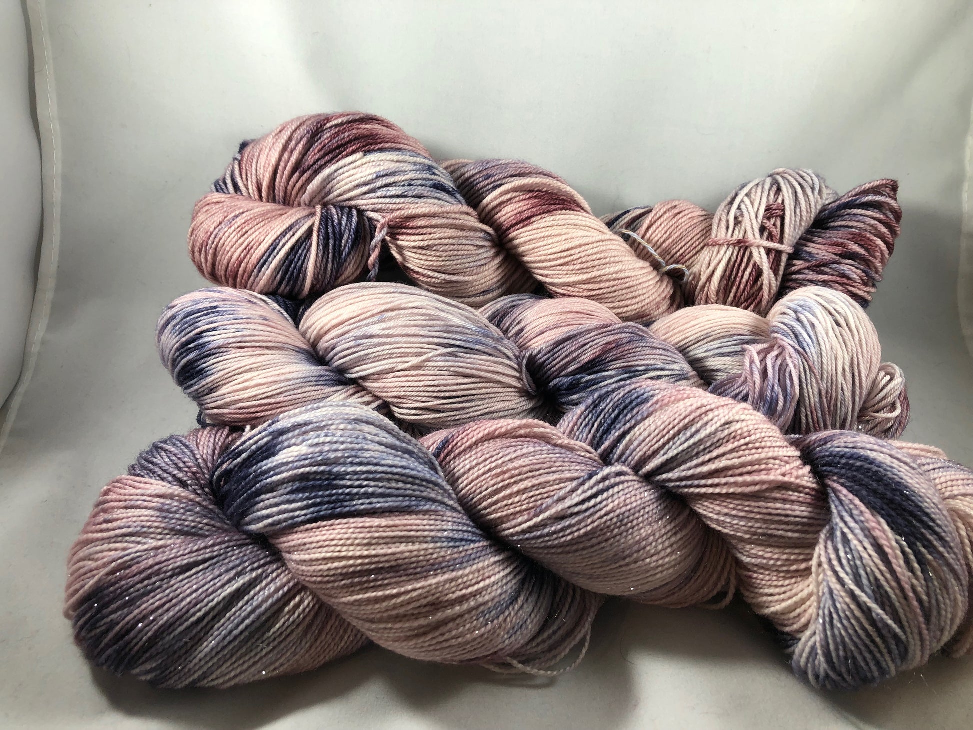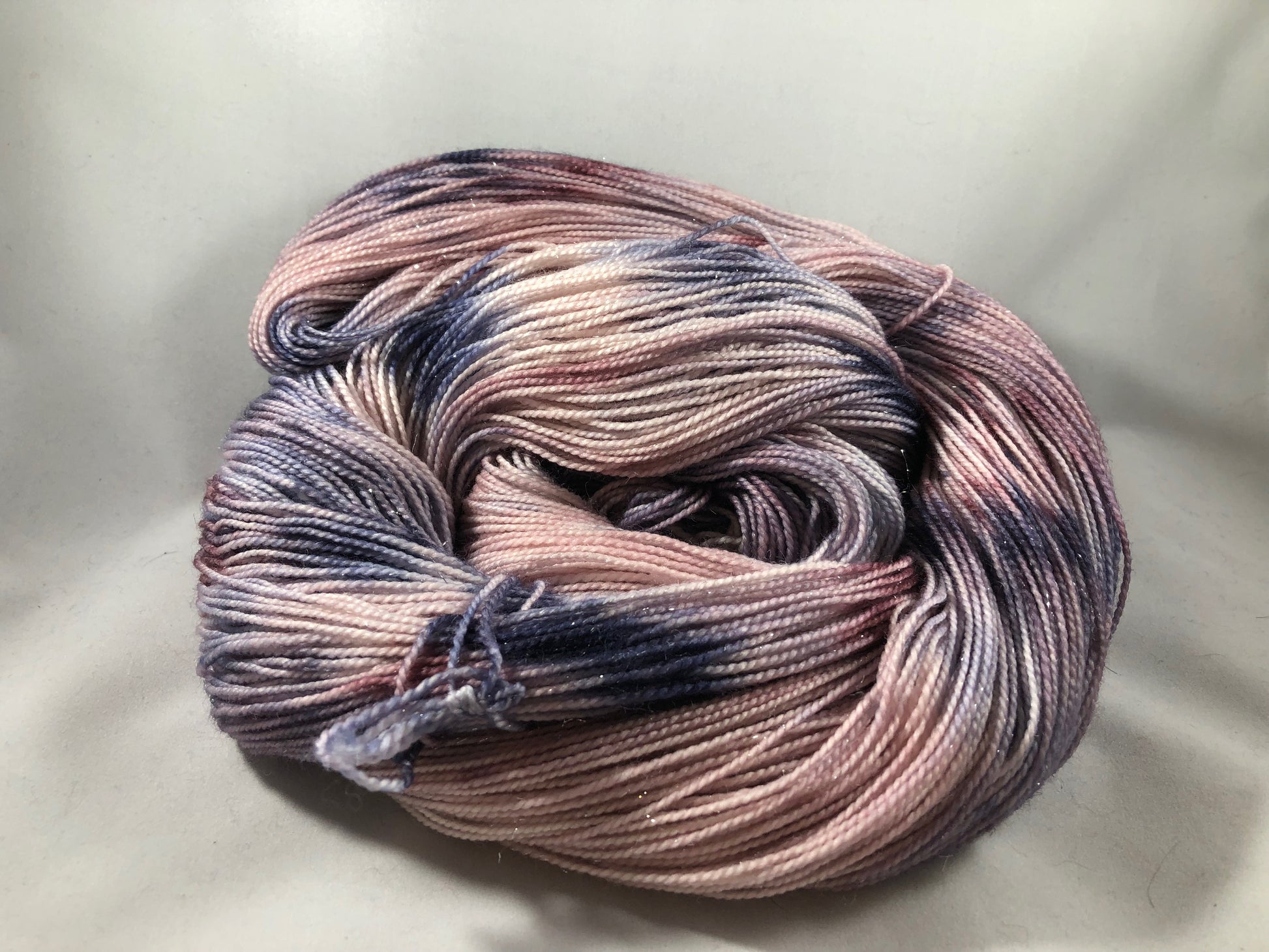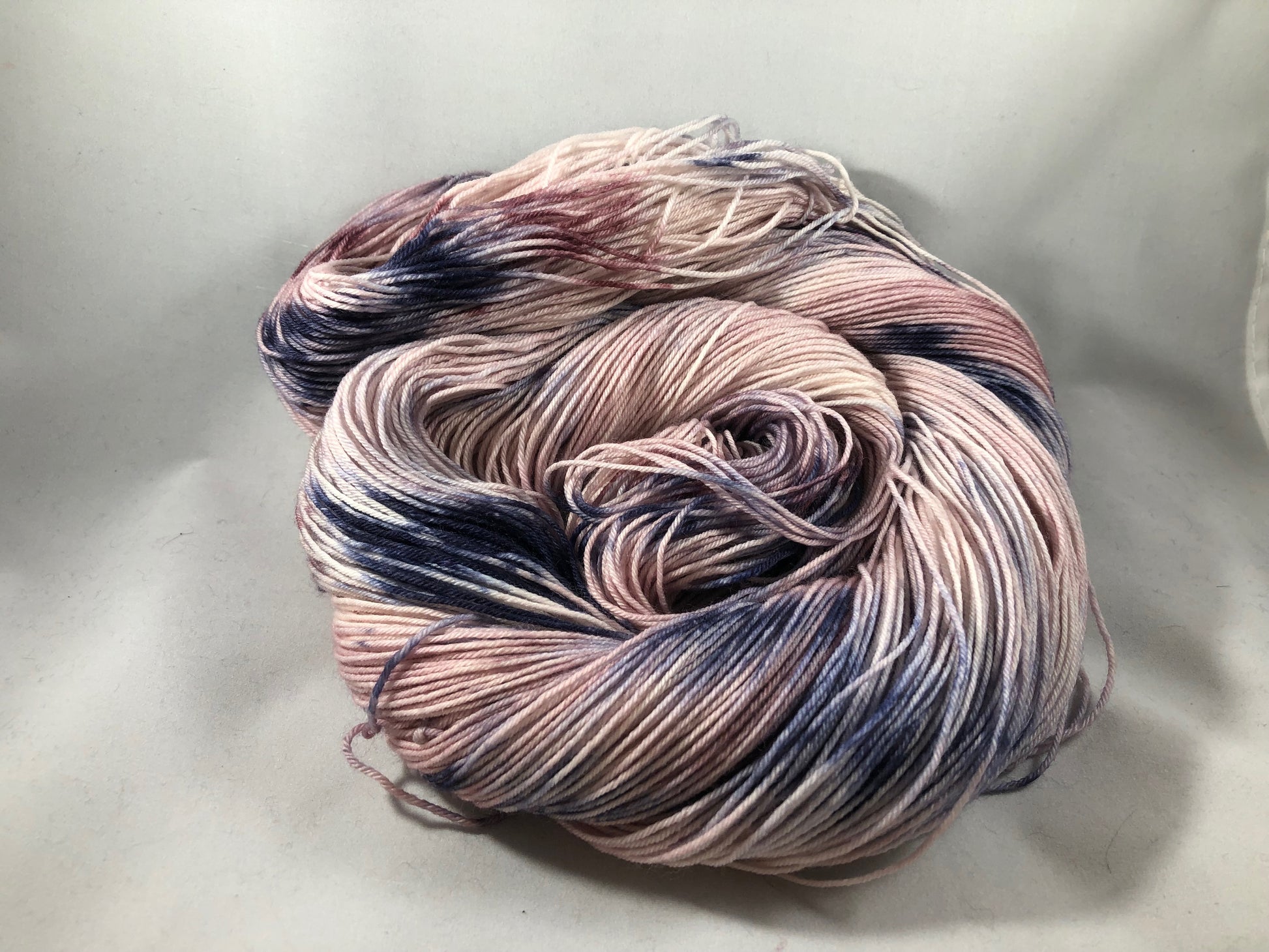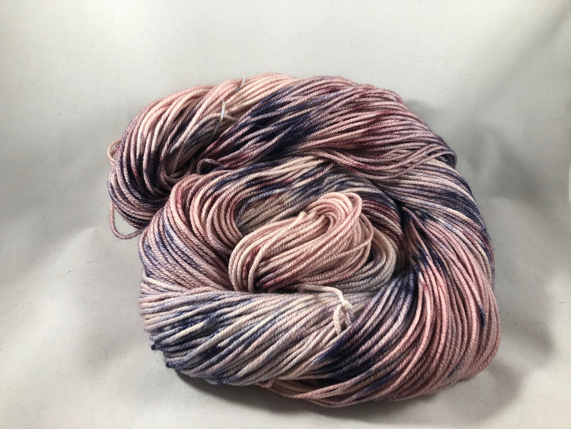 This variegated yarn has a base of pale mauve mottled with deeper mauve and navy blue.