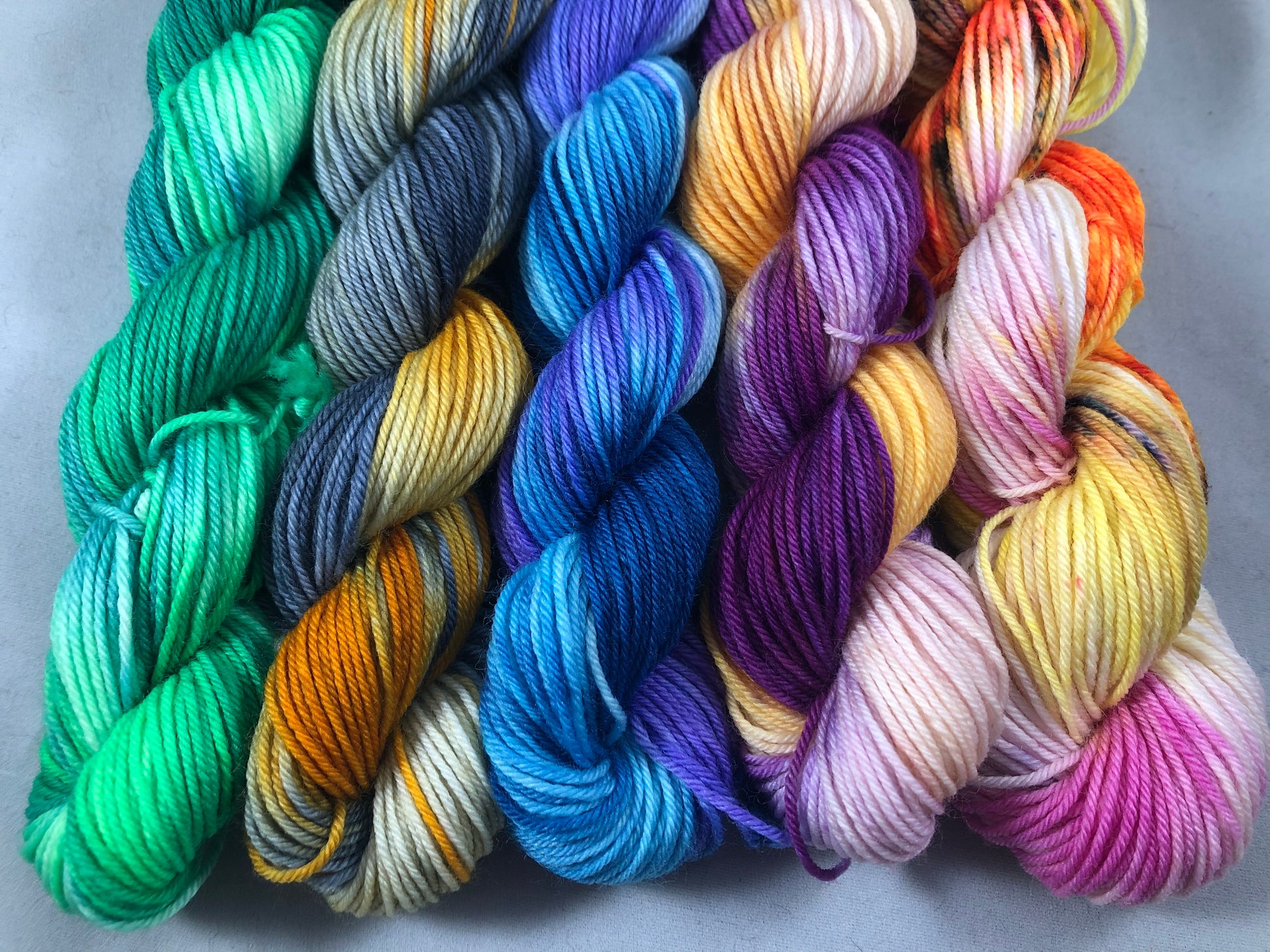 Mini Skeins - 4 Plies of the Apocalypse= 100 grams total, about 436 yards. 20 grams and about 87.2 yards per color.