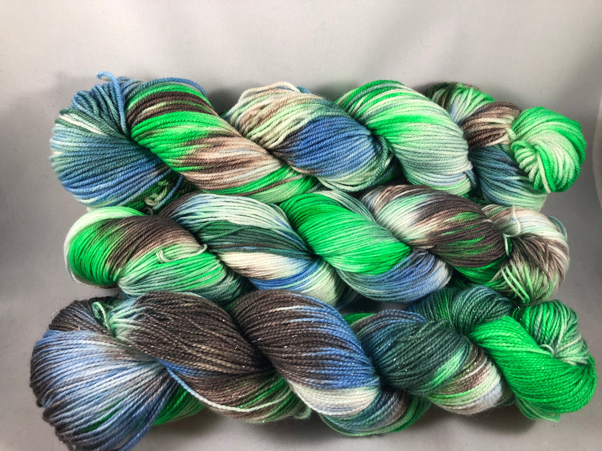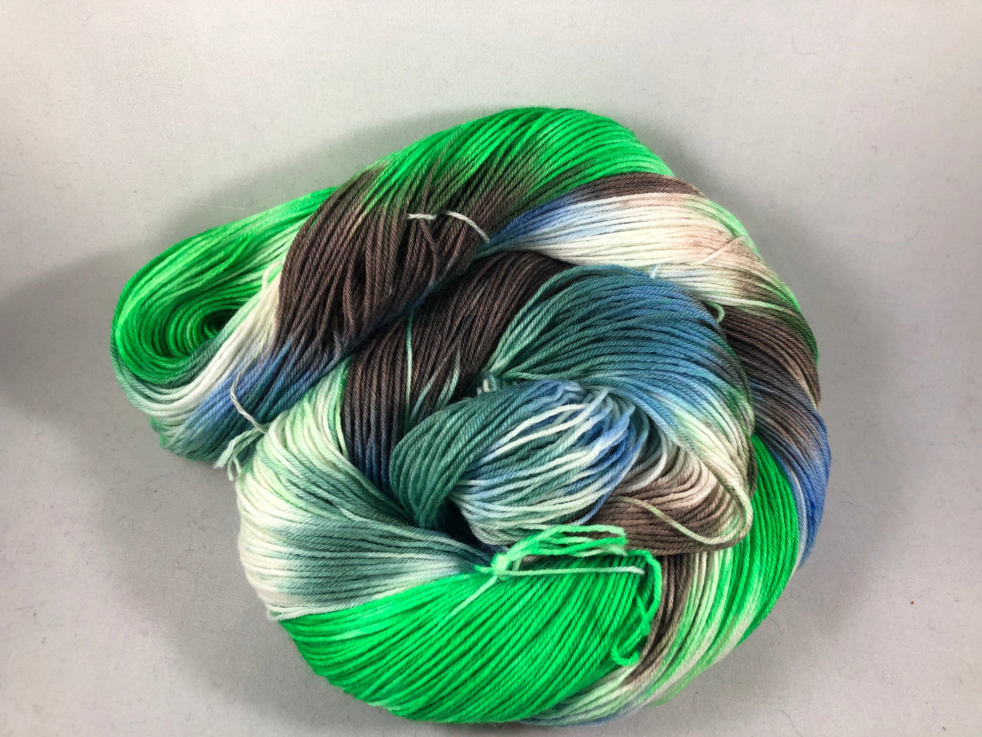 Greens, brown and blue paint the landscape of the shire in this hobbit-inspired variegated colorway.