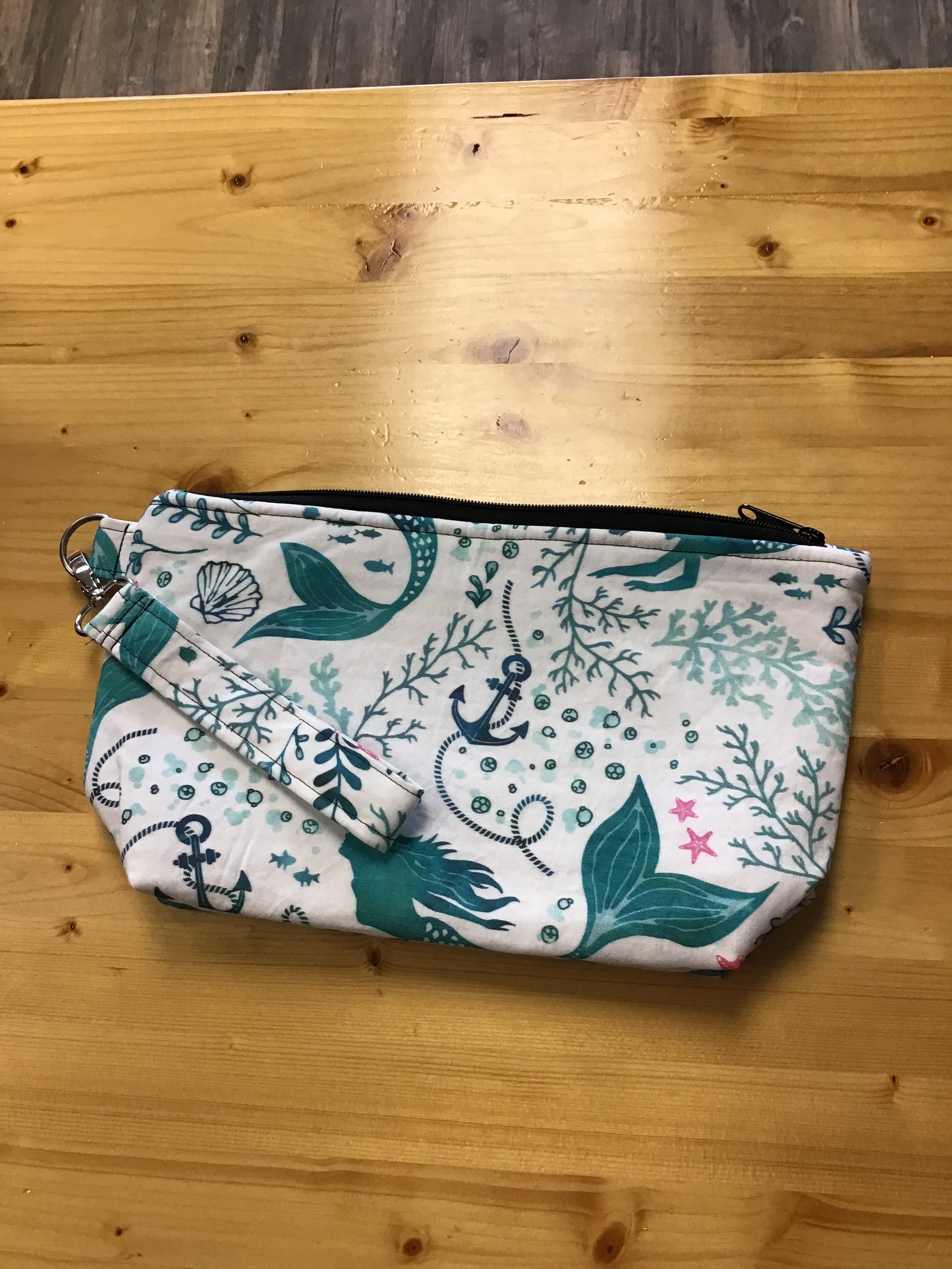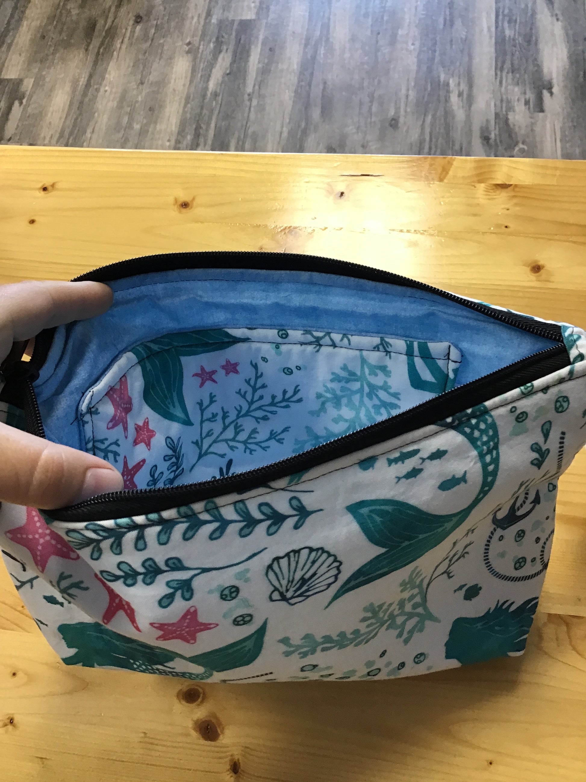 Adorable bag with black zipper and light blue inner fabric. One inner pocket for stitch markers and scissors. Perfect for sock projects, Amigurumi or small projects on the go.