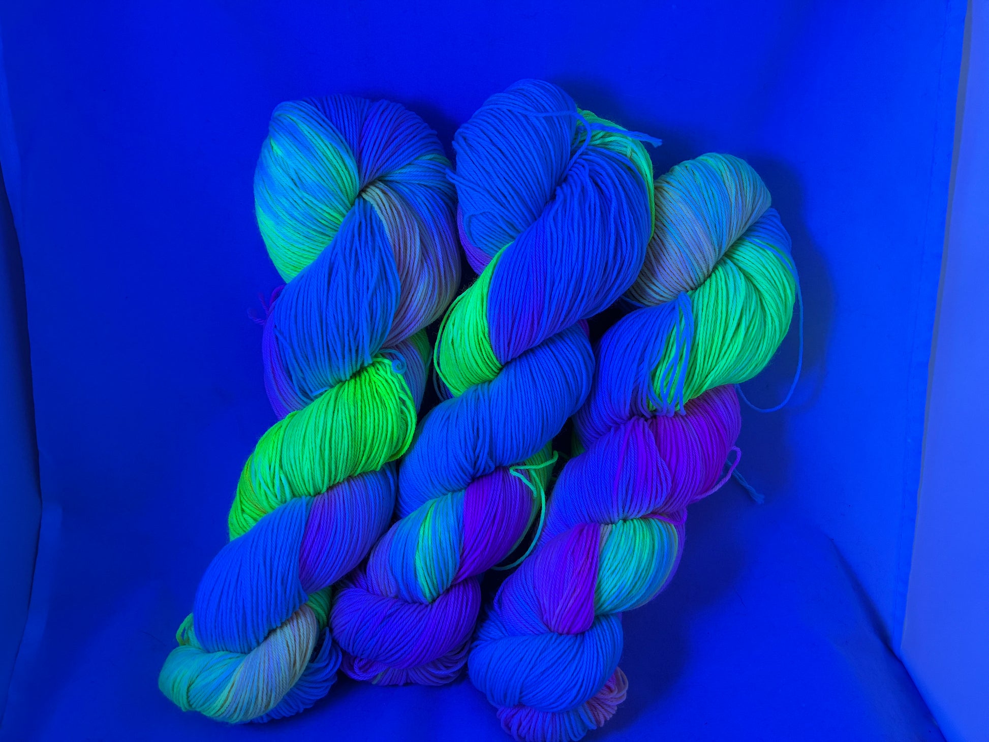 Unicorn is a blend of light yellow, blue and pink fluorescent glow over a subtle platinum base, all dyed up on 4 Plies of the Apocalypse.
