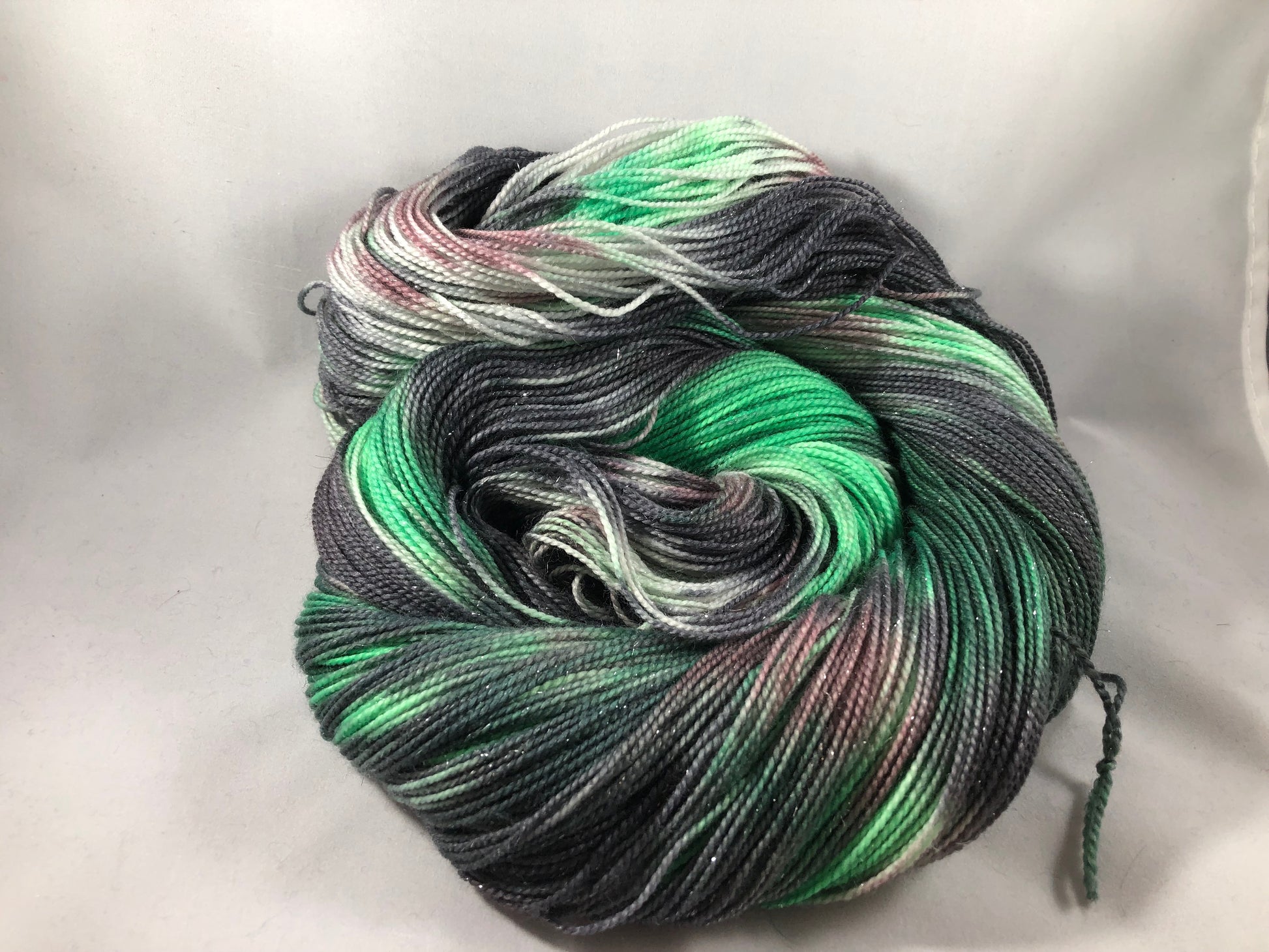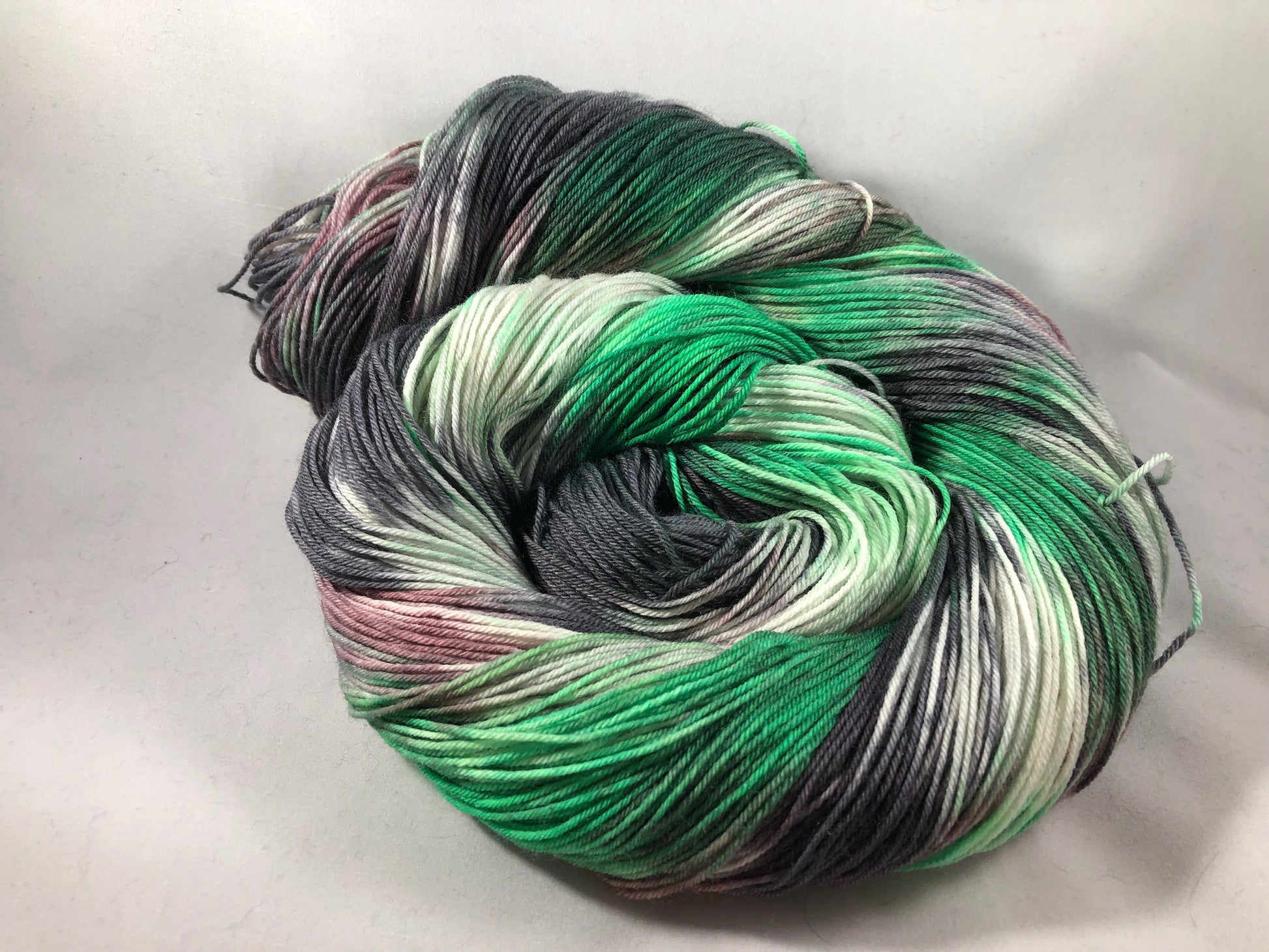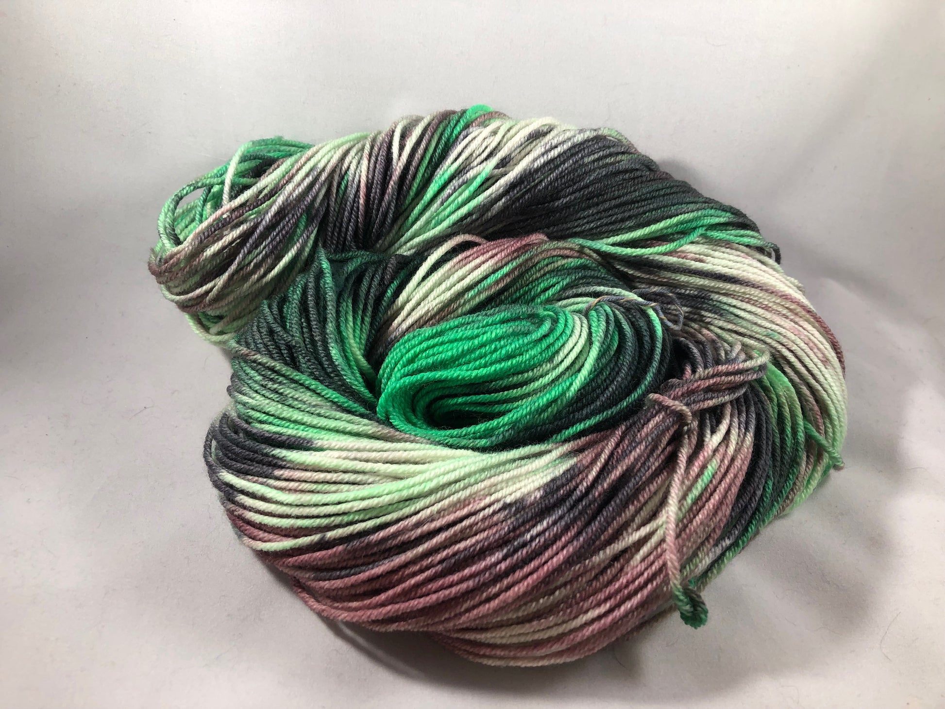 This colorway includes green, mauve and black twisted together.
