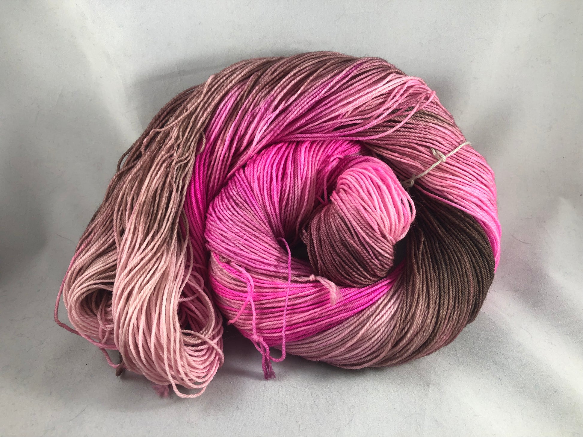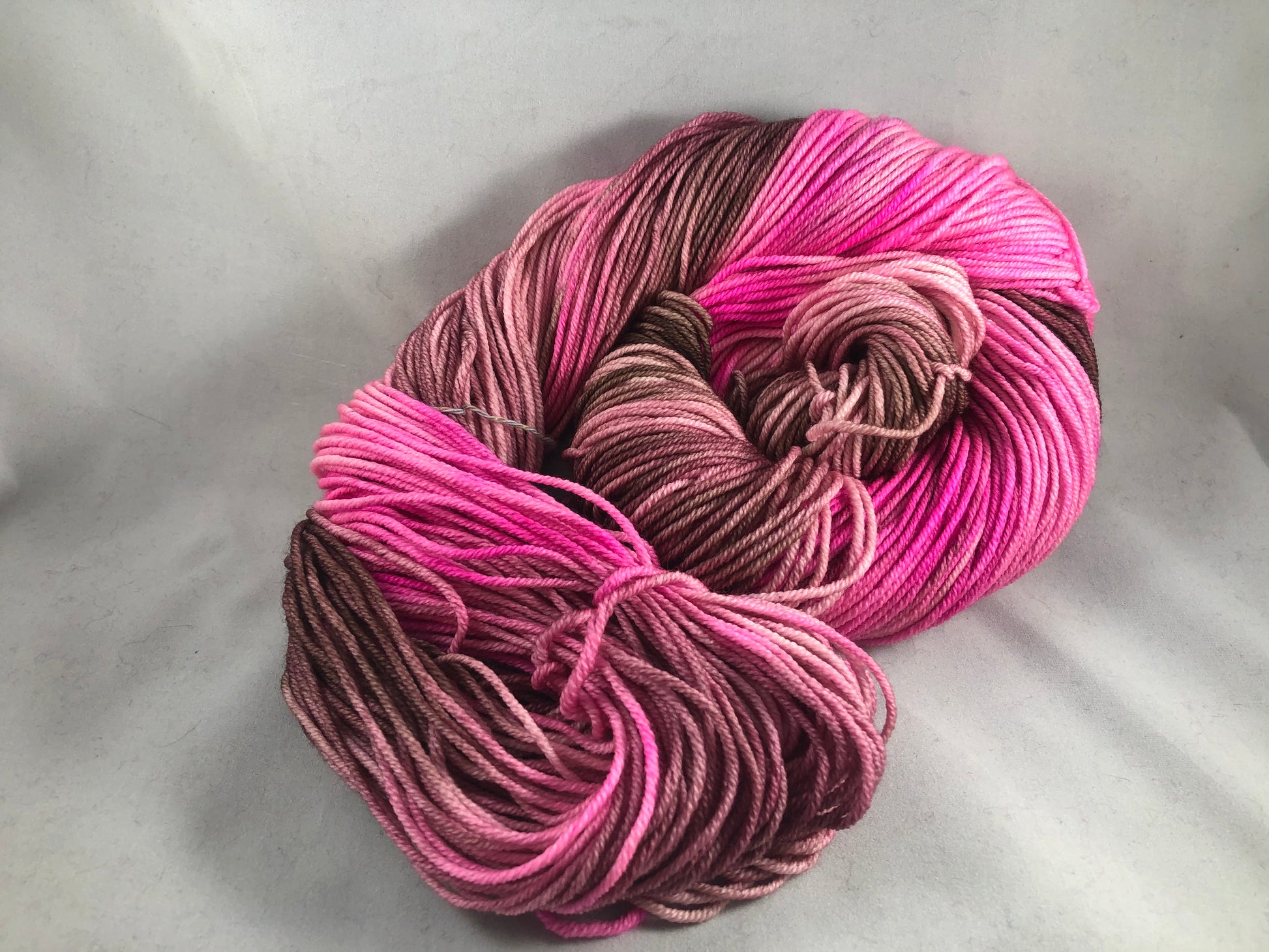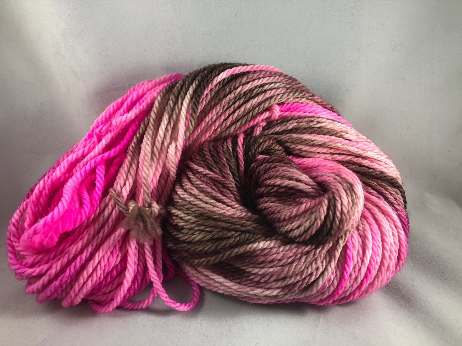 This variegated colorway combines fluorescent magenta, hot pink, mauve and browns.