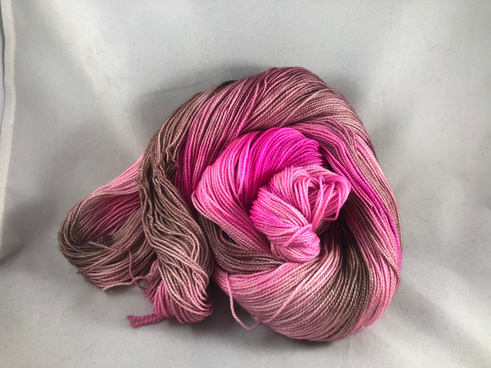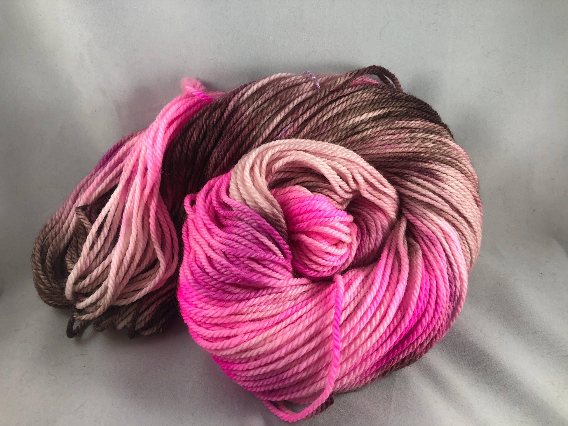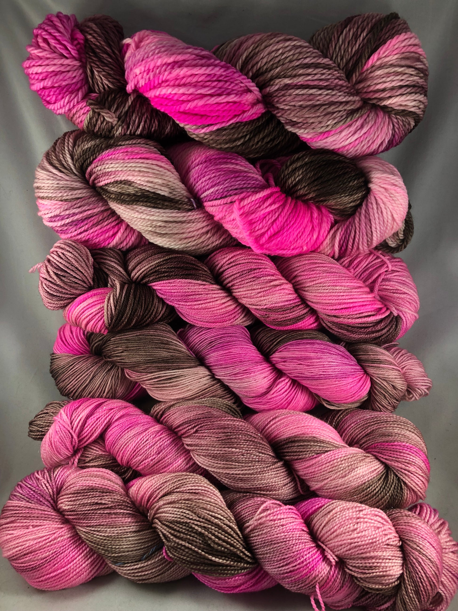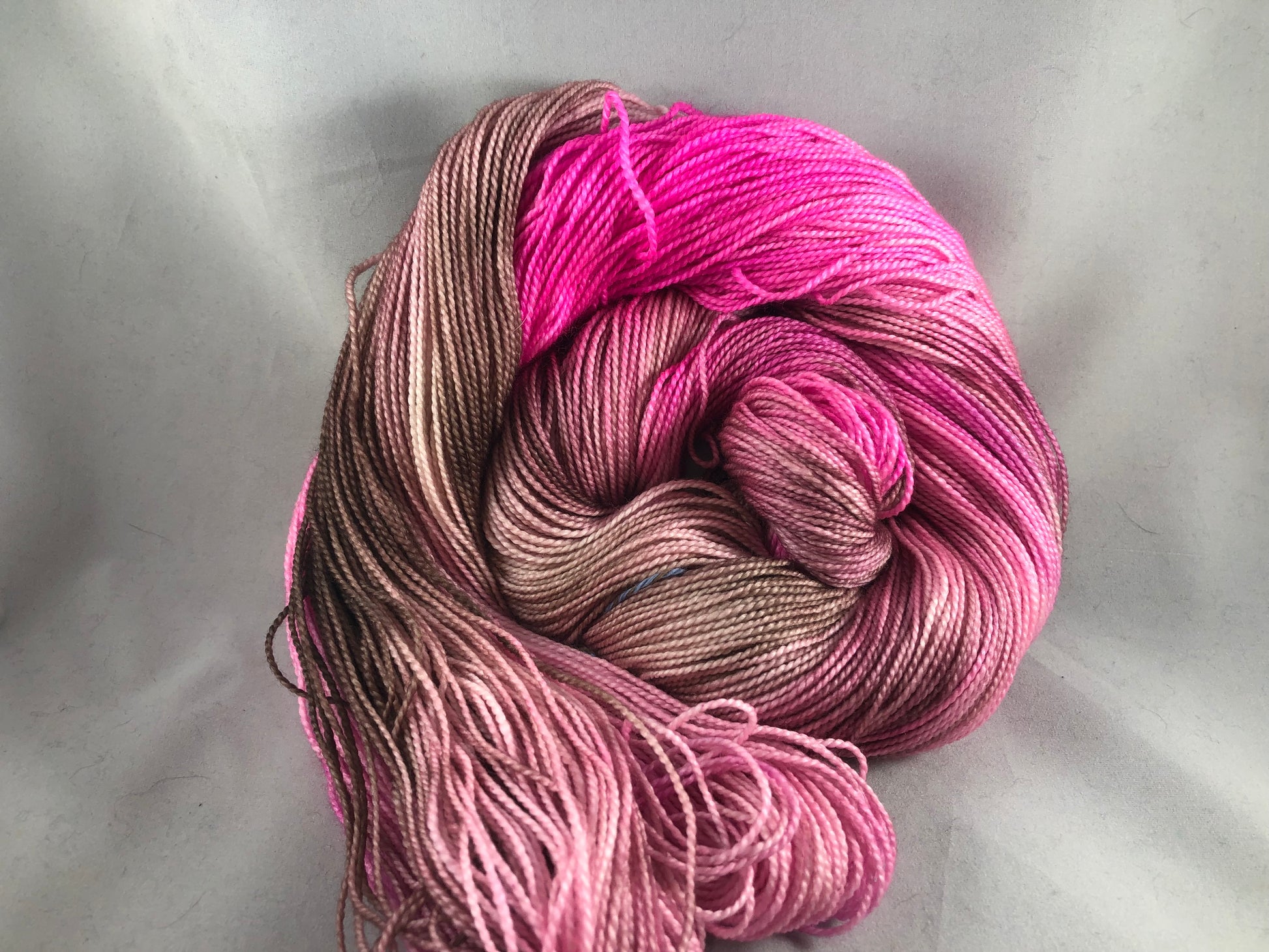 This variegated colorway combines fluorescent magenta, hot pink, mauve and browns.