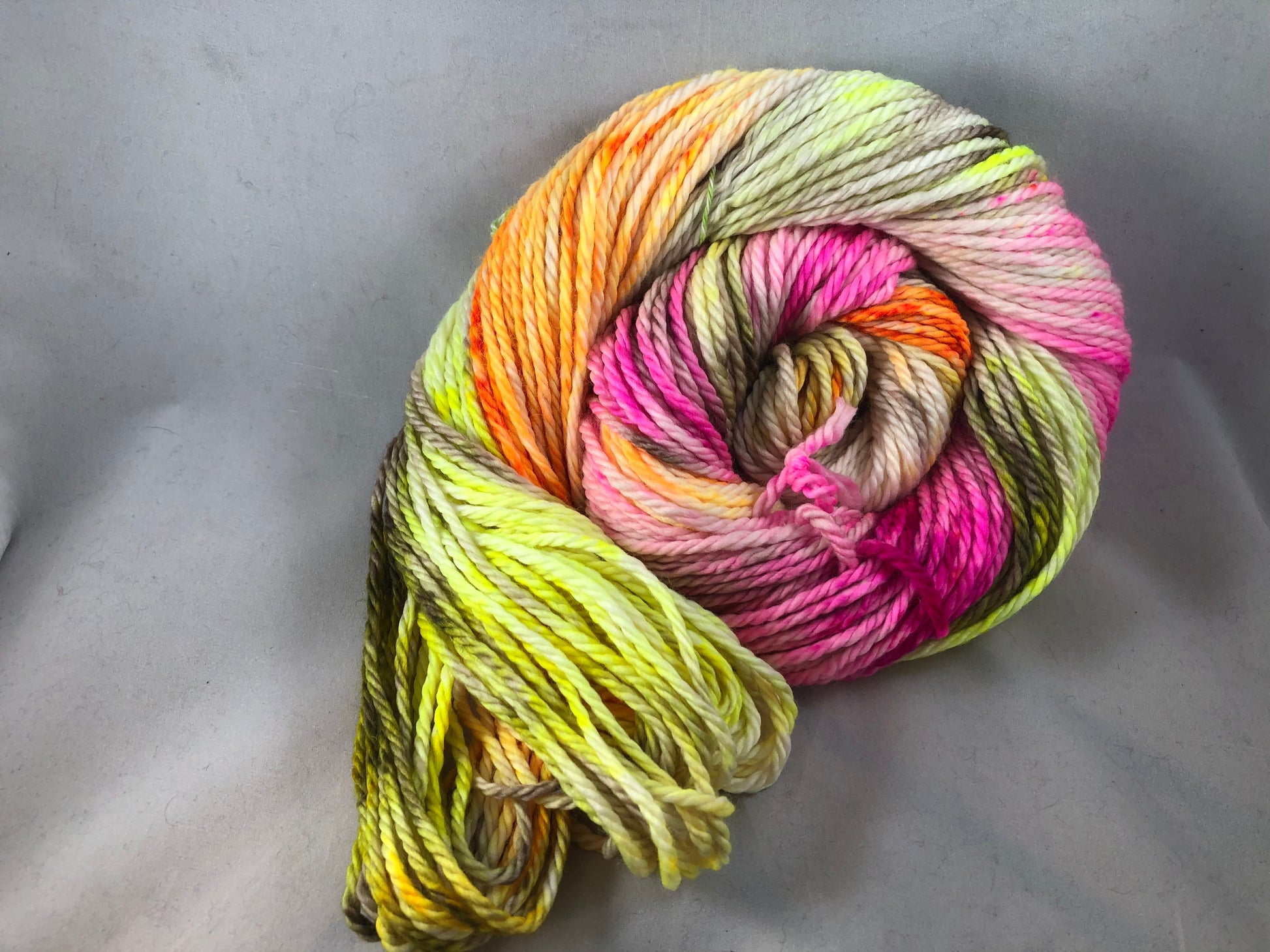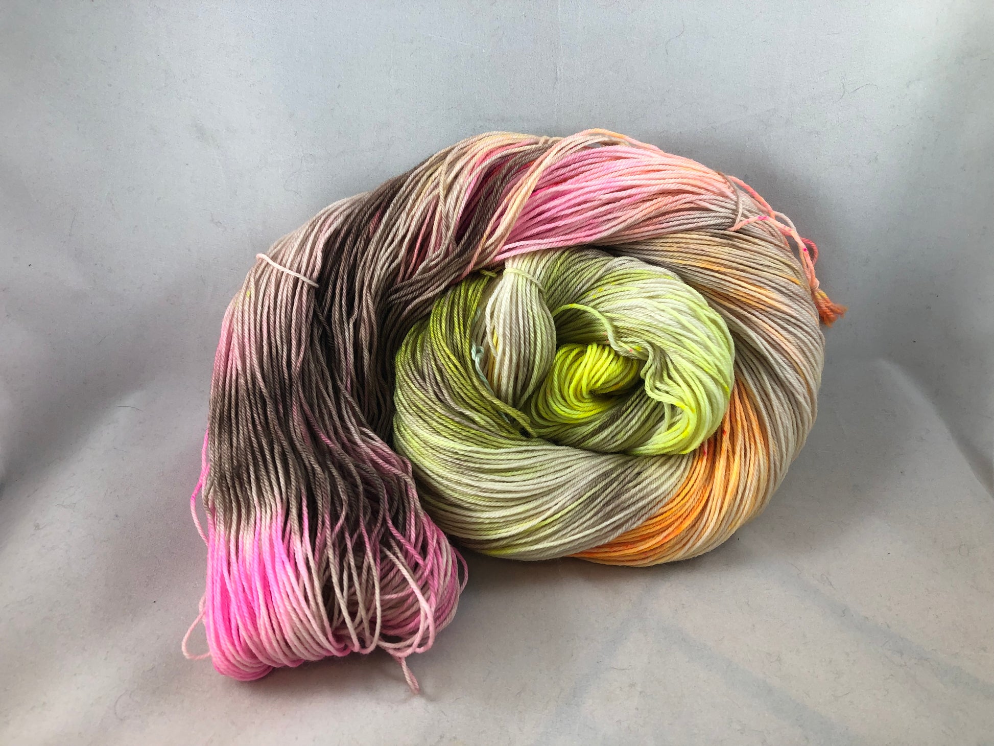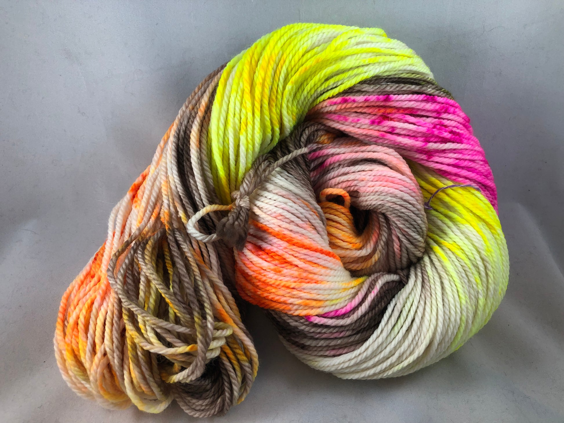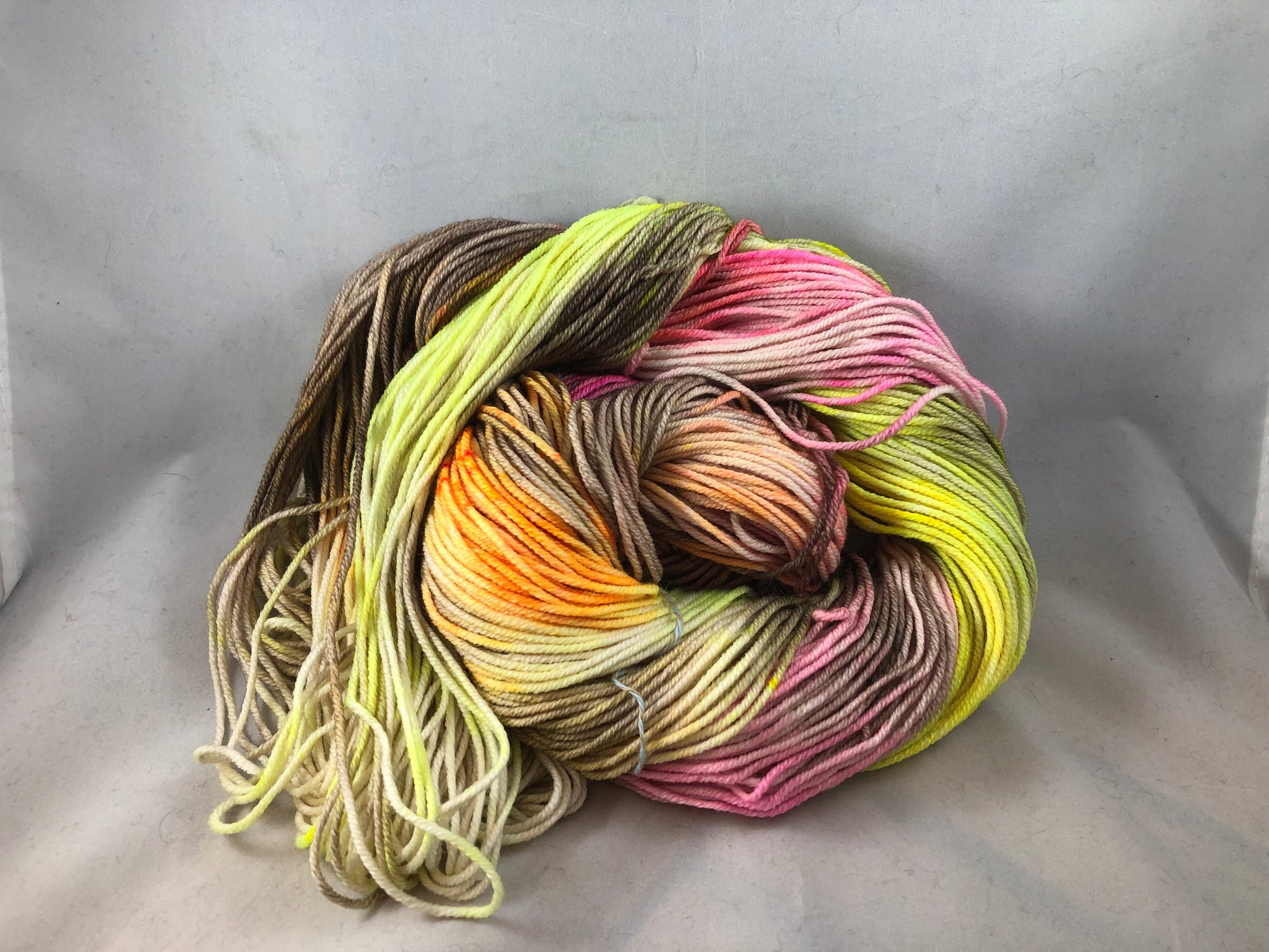 This variegated colorway layers superb shades of brown with a splashy speckling of fluorescent yellow, pink & orange.