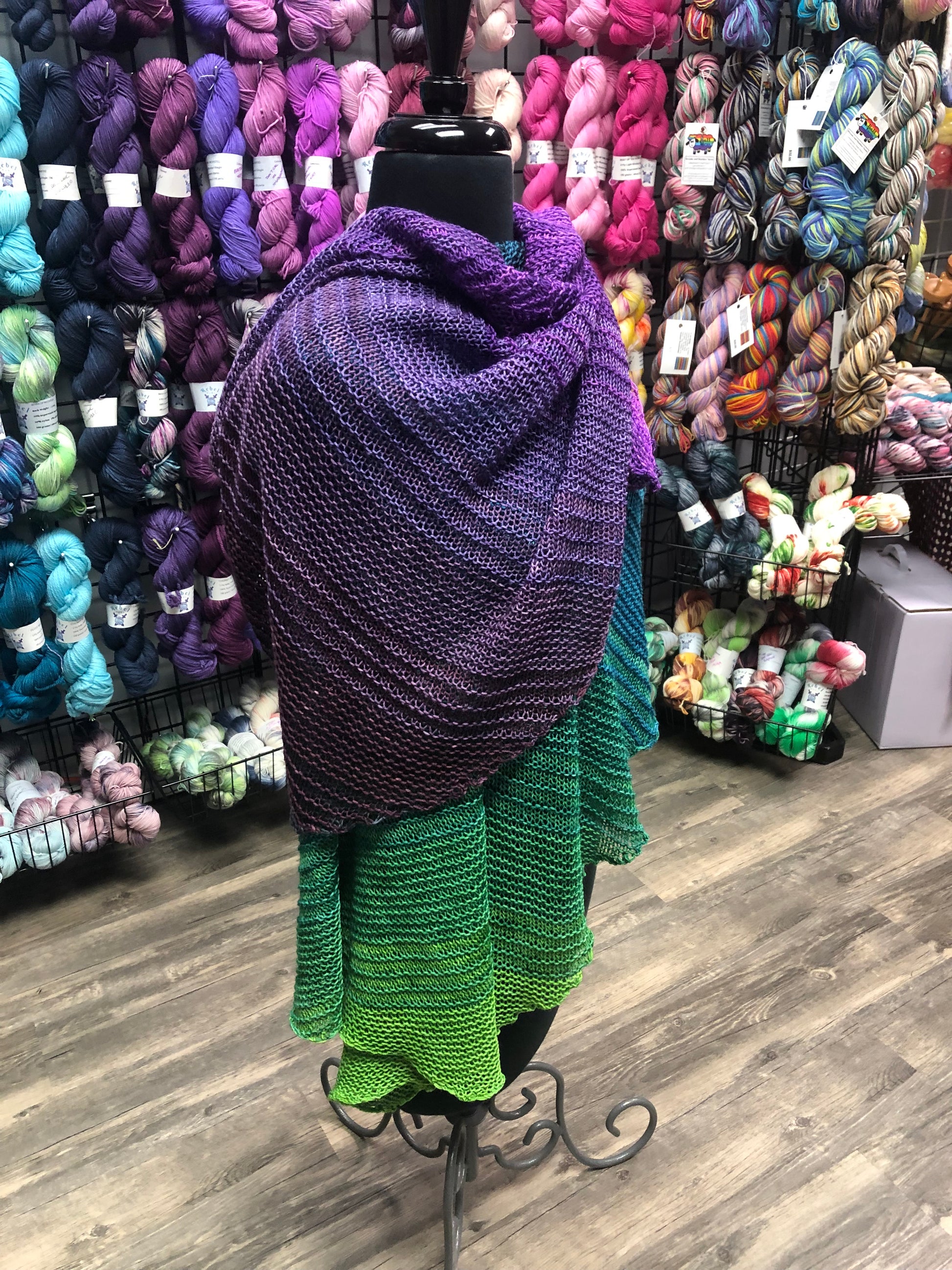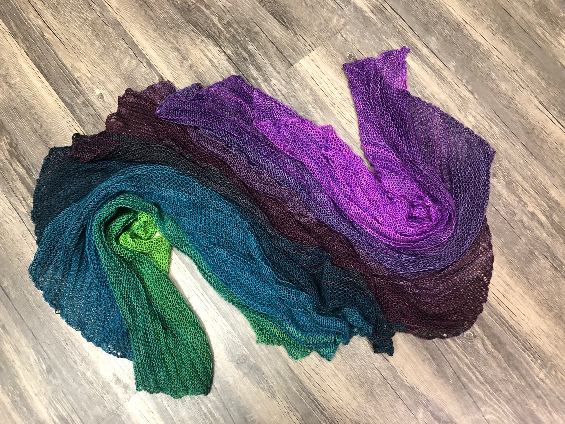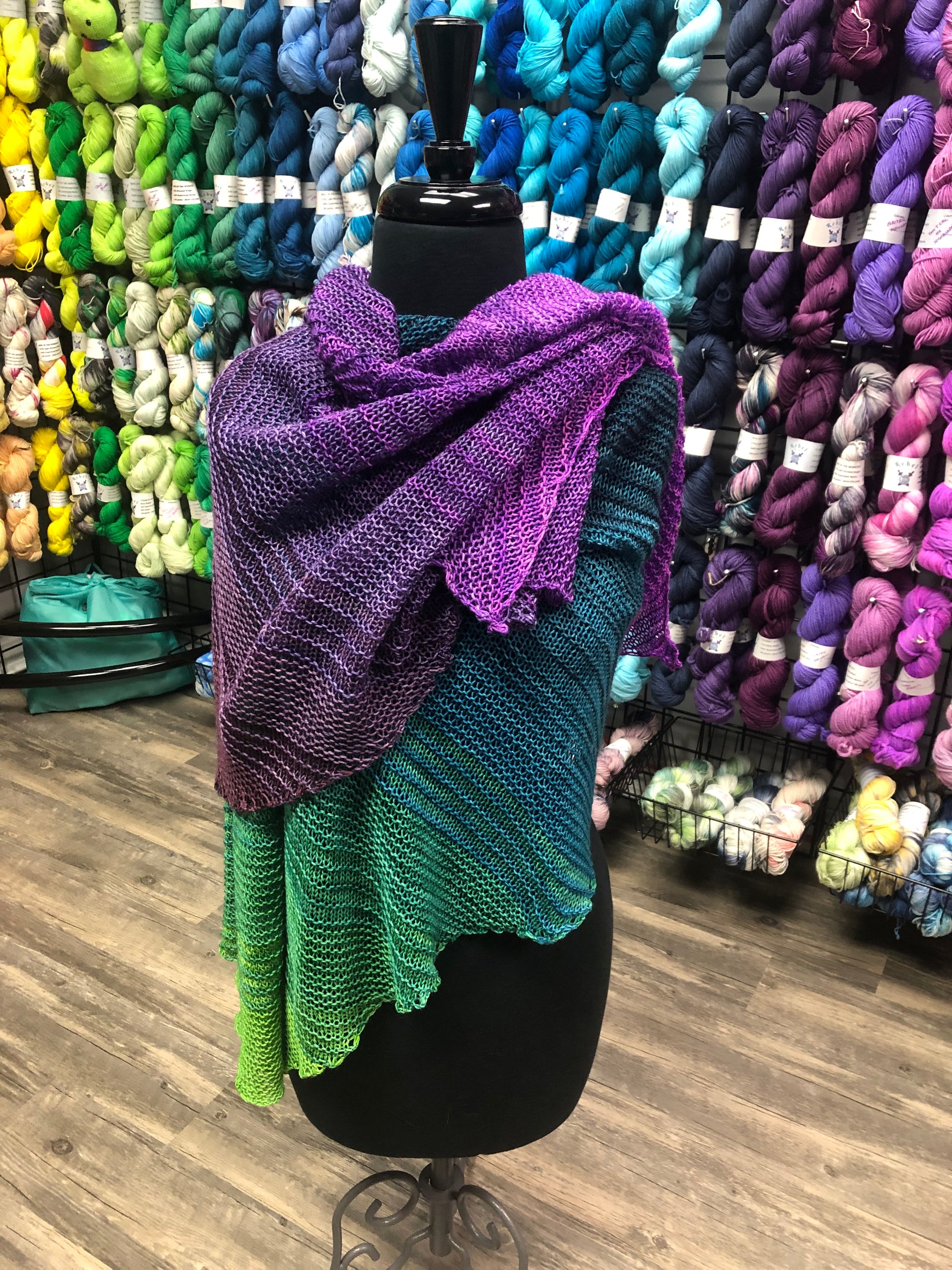The colors are a fade from fluorescent purple to fluorescent green, via black in the center. The wrap is garter knit on the bias and it makes a giant fluffy wrap.