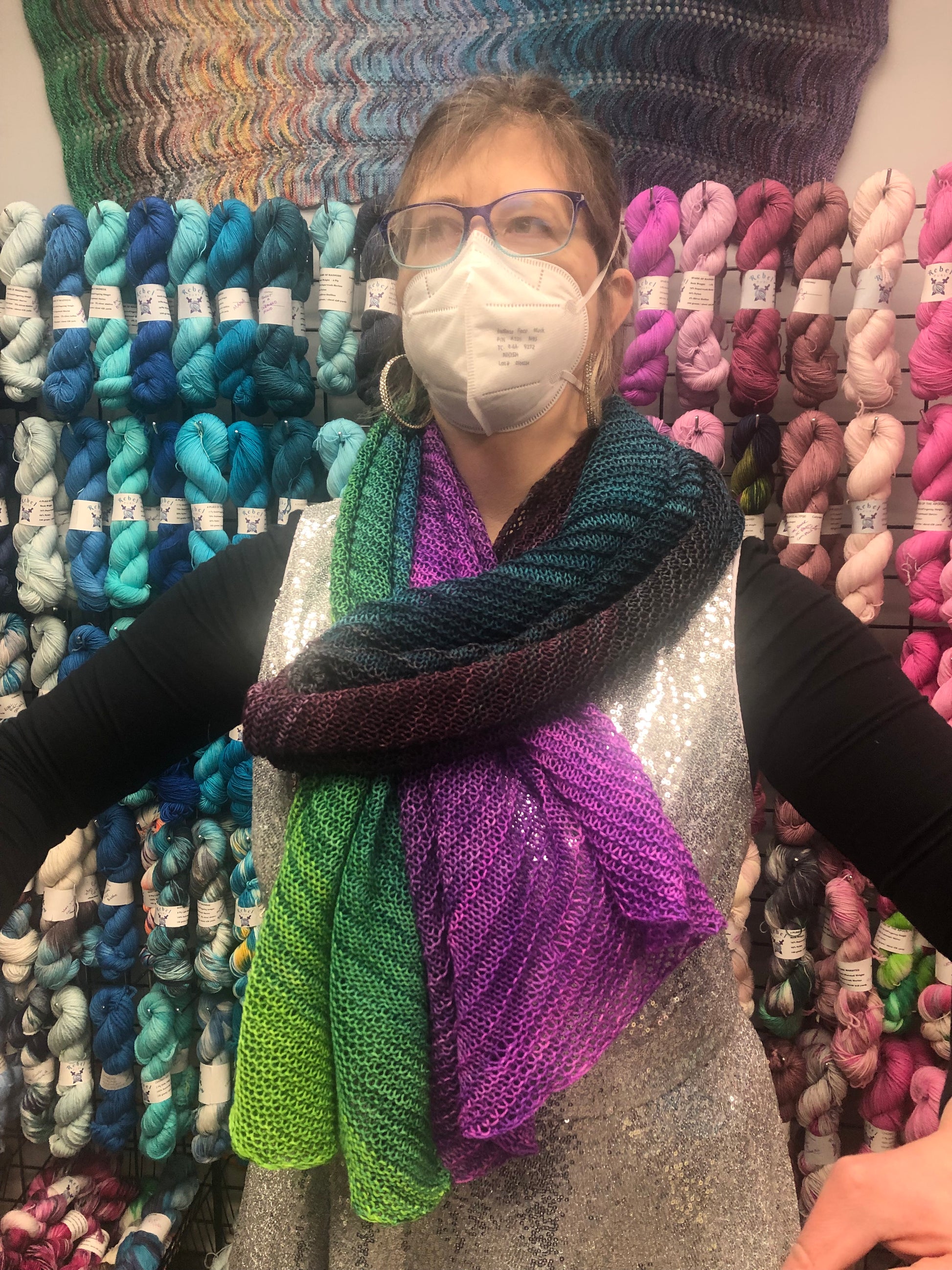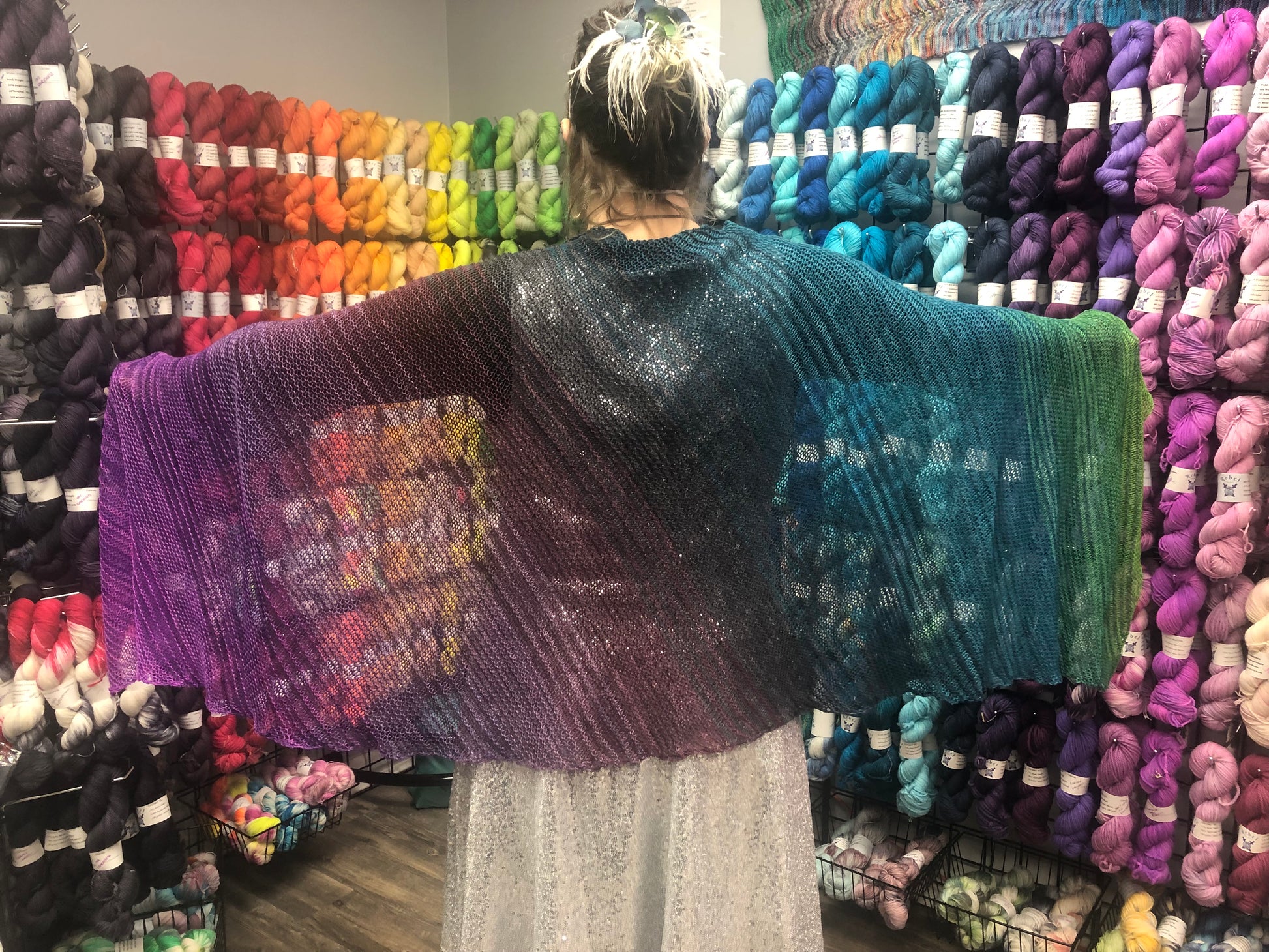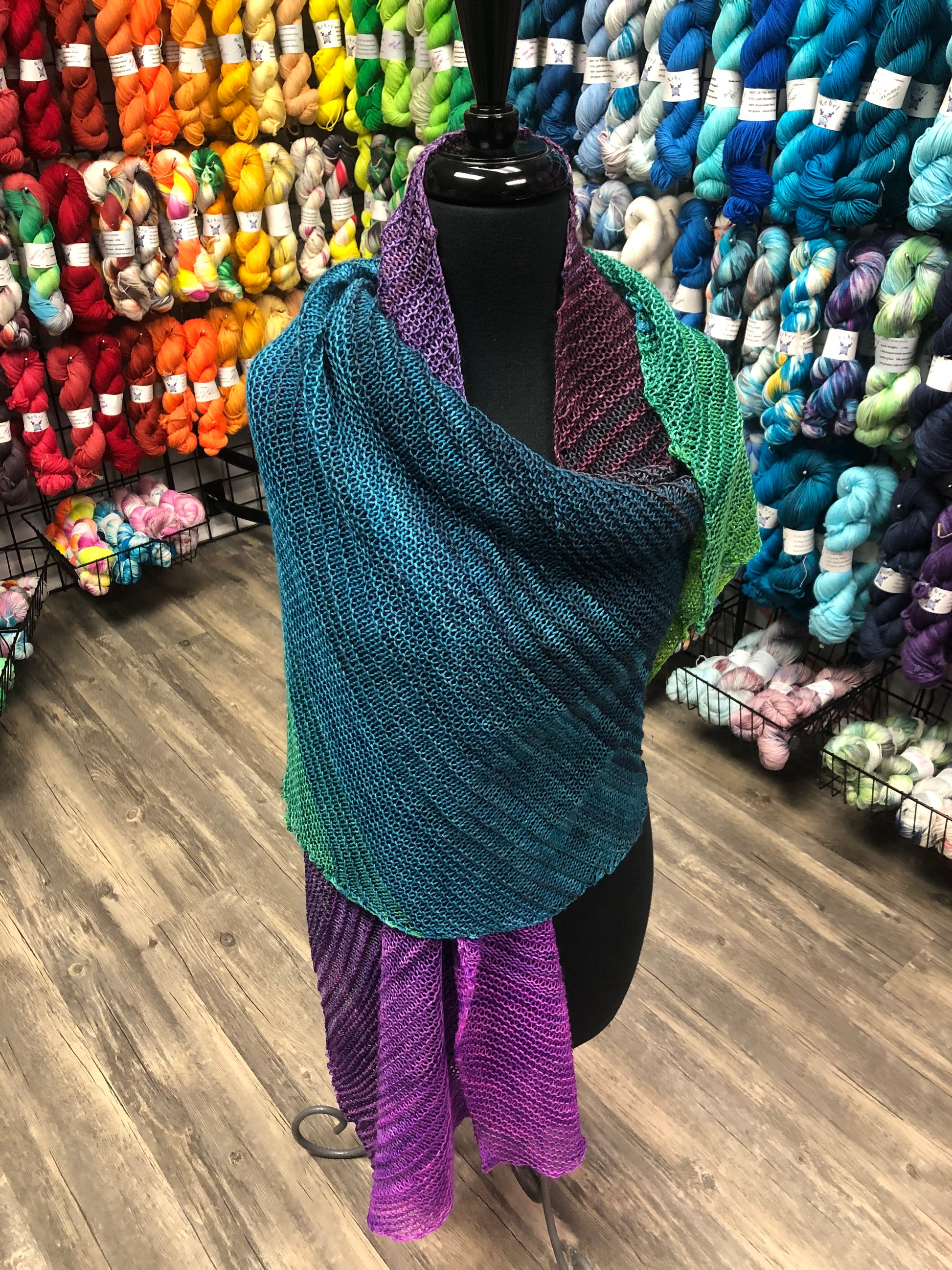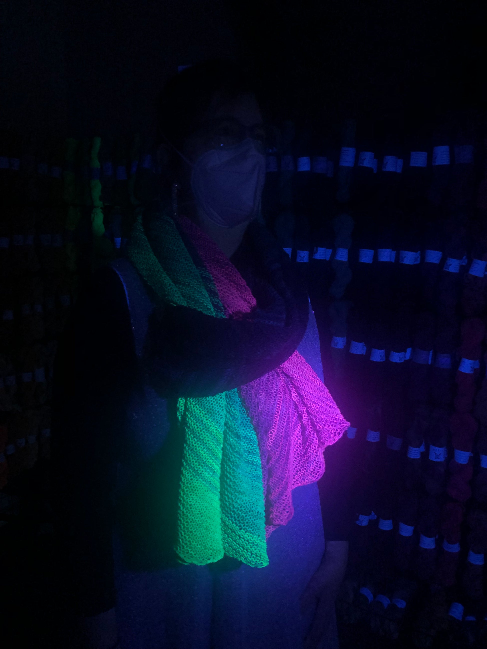 The colors are a fade from fluorescent purple to fluorescent green, via black in the center. The wrap is garter knit on the bias and it makes a giant fluffy wrap.